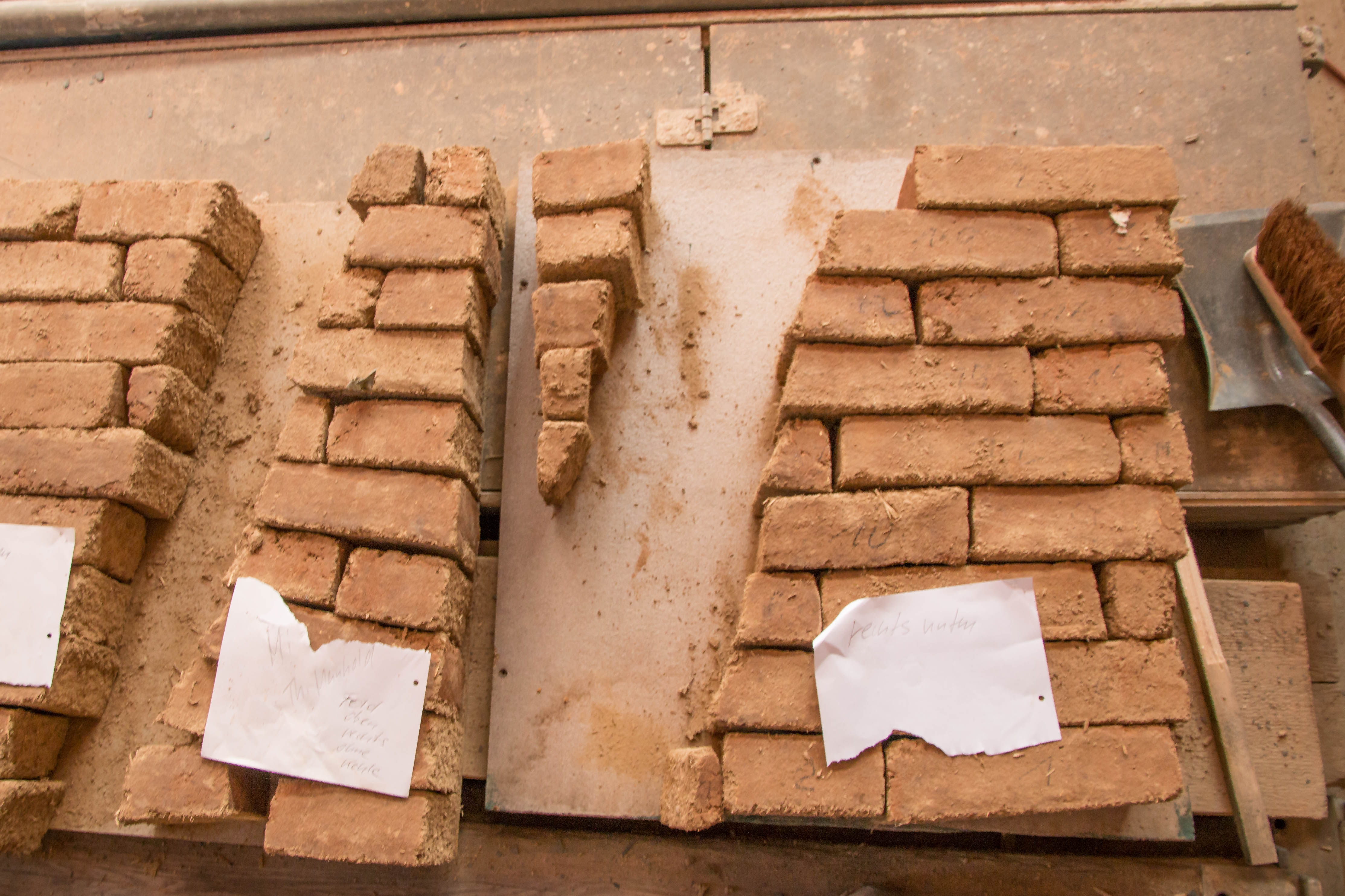 Das Fachwerk musste zum großen Teil neu ausgefacht werden. Die überlassenen Lehmziegel sowie Lehmziegel aus professioneller Produktion kamen zum Einsatz.