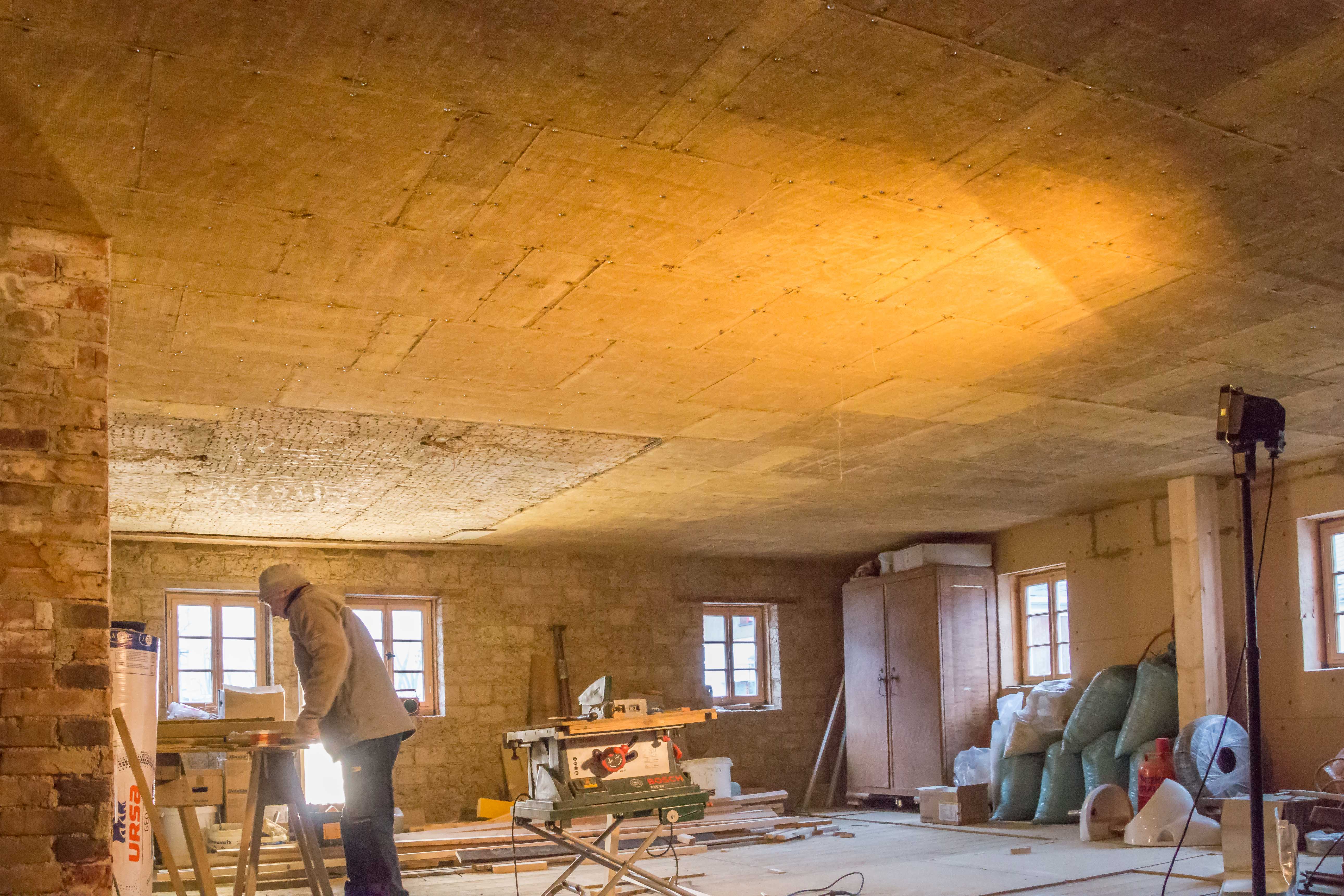 Die erhaltenen Stakendecken wurden an schadhaften Stellen fachgerecht instandgesetzt. In Bereichen, in denen frühere Eingriffe eine erneute Ausfachung mit Staken nicht sinnvoll erscheinen ließen, kamen Lehmdeckenplatten zum Einsatz. Diese erhielten einen verstärkenden Aufbau aus einem Lehm-Holzfasergemisch. Für die Wärmedämmung wurden Holzflexmaterial und Zellulosefasern verwendet – ebenfalls ökologische Materialien, die das Gesamtkonzept konsequent fortführen.