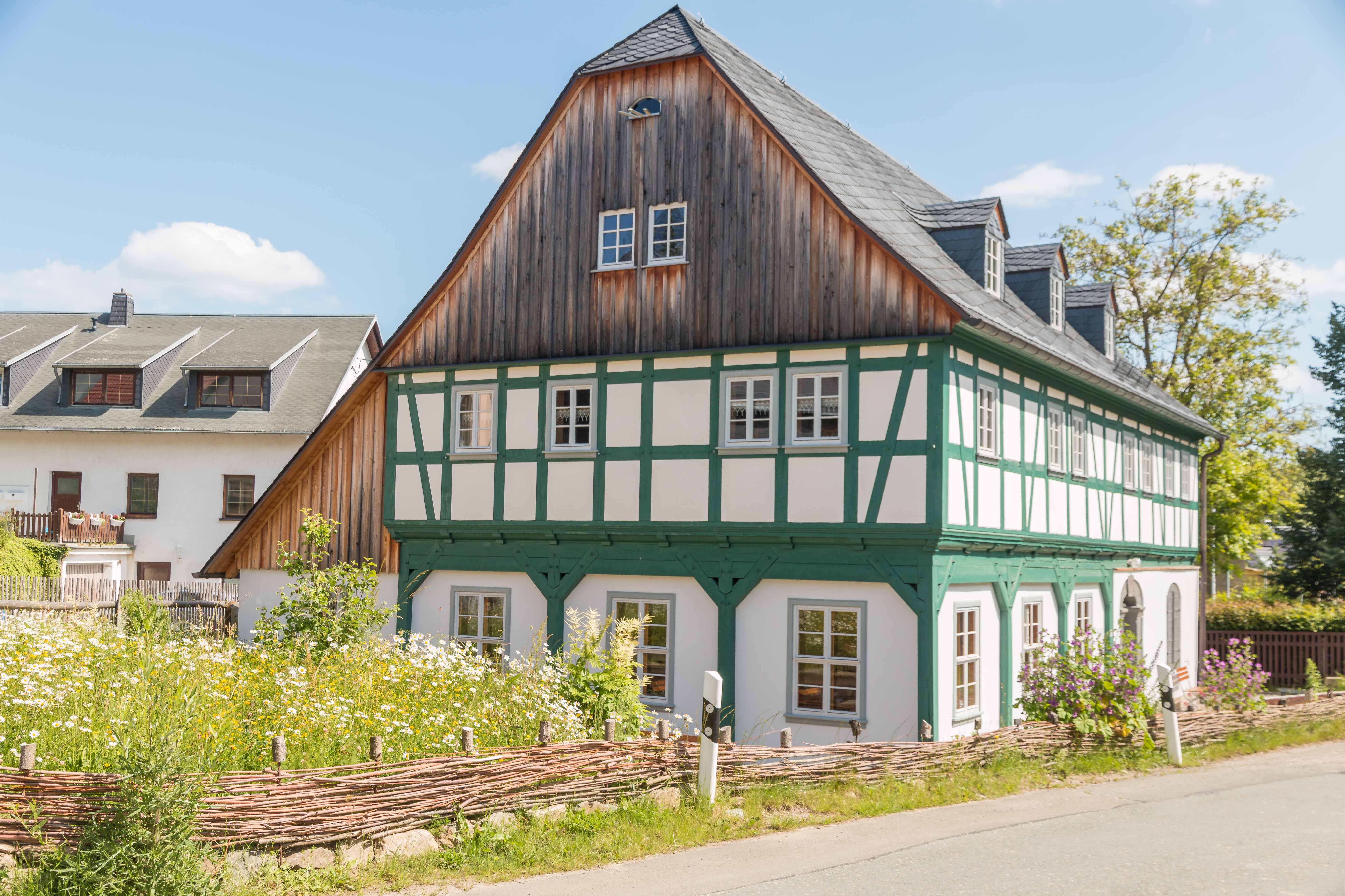 Der Zugang zum Hintereingang wurde mit heimischem Schiefer neu angelegt – ein bewusst gewähltes Material, das die regionale Baukultur widerspiegelt. Der Bereich zwischen Nordgiebel und Durchgangsstraße erhielt eine gepflasterte Fläche, die Struktur und Klarheit schafft. Zwischen Thomas-Müntzer-Straße und Zugang entstand eine geschotterte Parkmöglichkeit.