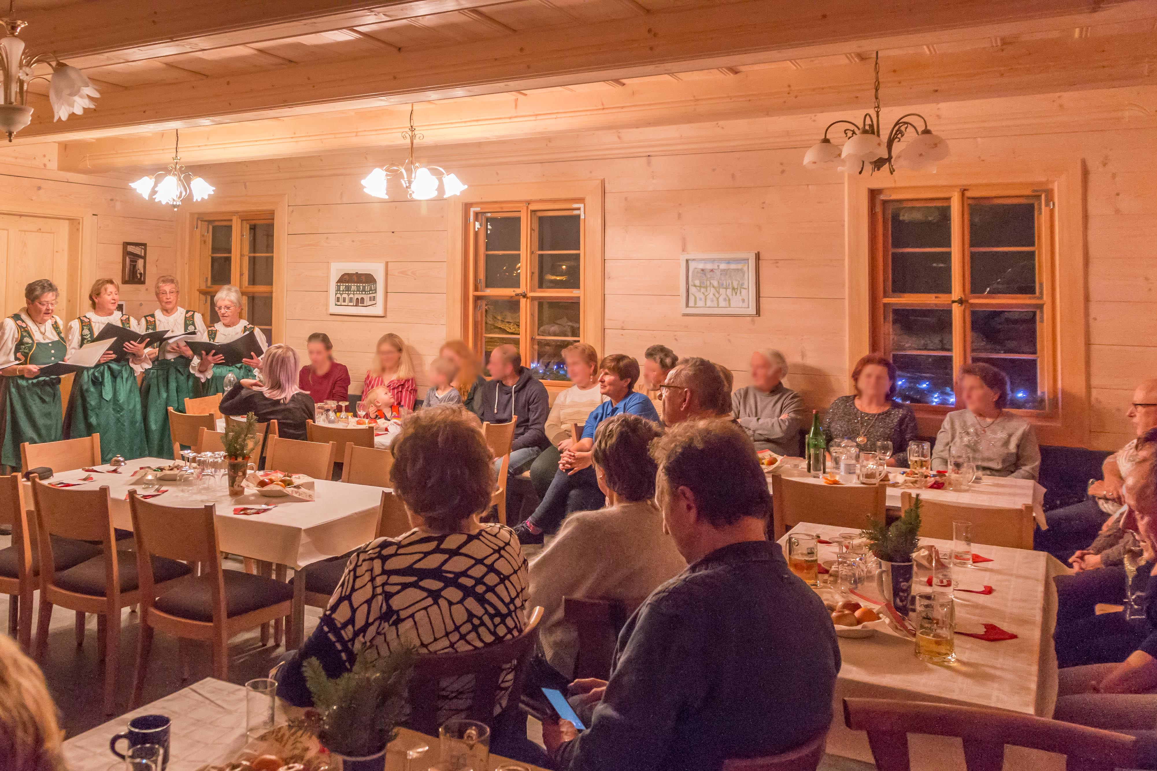 Heute bietet die Blockbohlenstube mit angrenzender Küche ideale Voraussetzungen für Feiern und Veranstaltungen mit bis zu 50 Personen. Das sichtbare Holz verleiht dem Raum eine warme und angenehme Atmosphäre. Eine Fußbodenheizung sorgt für gleichmäßige Wärme, während ein Kamin besonders an Winterabenden eine heimelige Stimmung schafft. So ist ein Raum entstanden, der Tradition, Handwerk und Gemeinschaft auf besondere Weise verbindet.